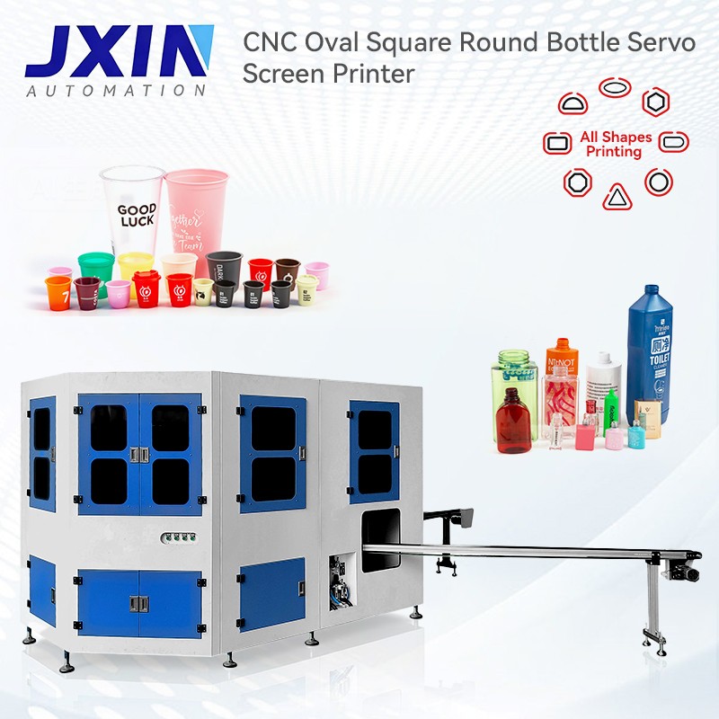 Fully servo motor driven , the machine can be availabe for round, oval, square plastic and glass bottle, print up to 3000 times per hour easily. Manual Jar/bottle placing on the conveyor belt and automatic pick-up, accurate 2 color screen printing, unloading can greatly reduce labor intensity of workers and improve production efficiency. Equipped with pre-press electrostatic dust removal system and sensor detection system, improves the quality of product printing and the flexibility of printing operations.It is a preffered option for printing of the glass bottle and glass jar packing manufacturer.